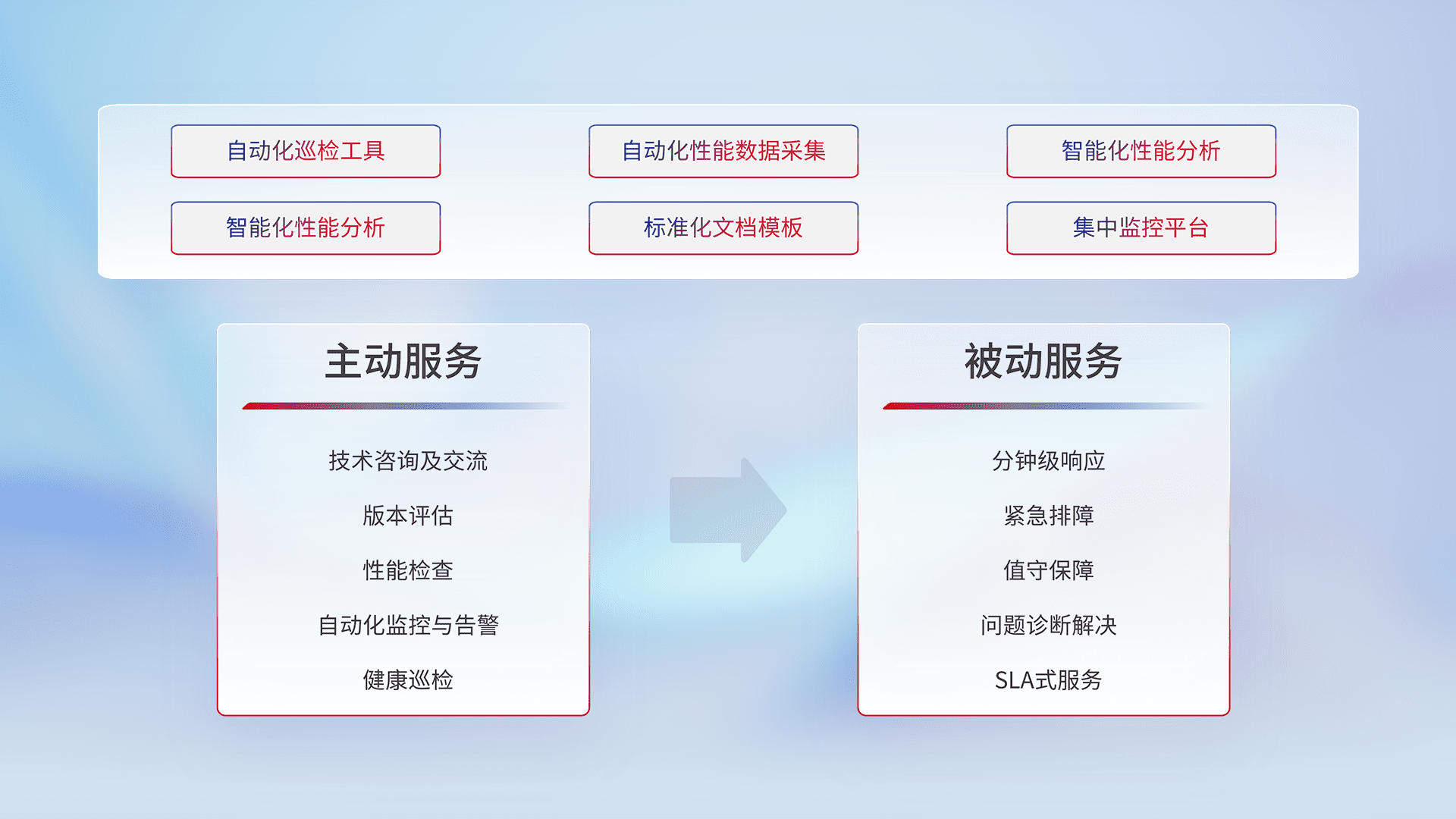 智能化工具和标准化文档,,保障服务质量,,提供主动服务(包含技术咨询、、版本评估、、、、性能检查、、、、自动化监控与告警、、健康巡检)和被动服务包含(分钟级响应、、、紧急排障、、、值守保障、、问题诊断解决、、SLA服务)。。。。