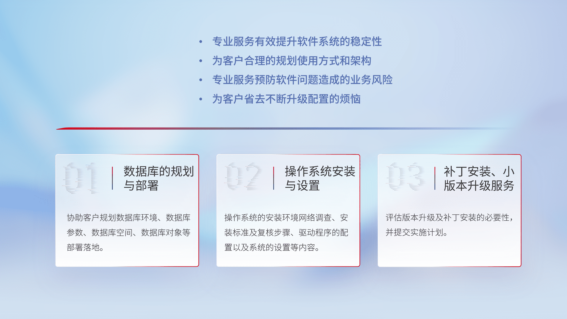 为客户提供软件规模升级、、快速部署、、、按需配置的专业服务,,,从数据库的规划与部署到操作系统的安装与设置,,,再到补丁安装和小版本升级提供支持。。。